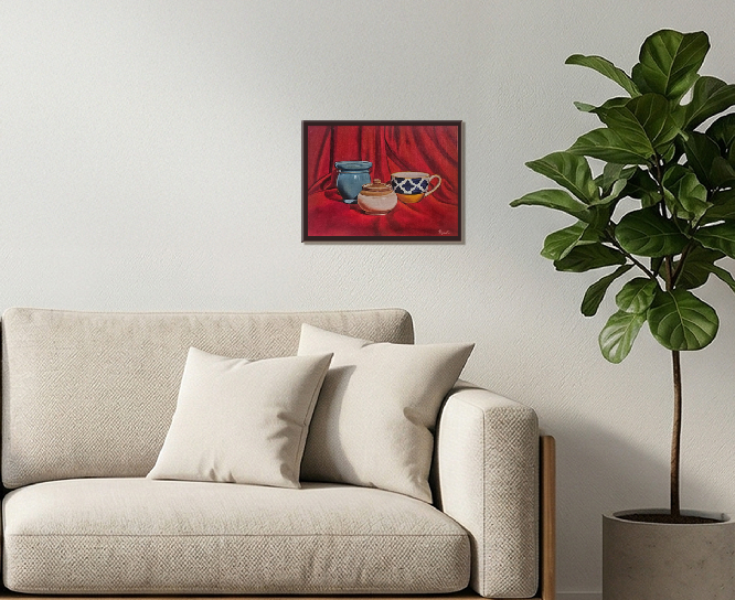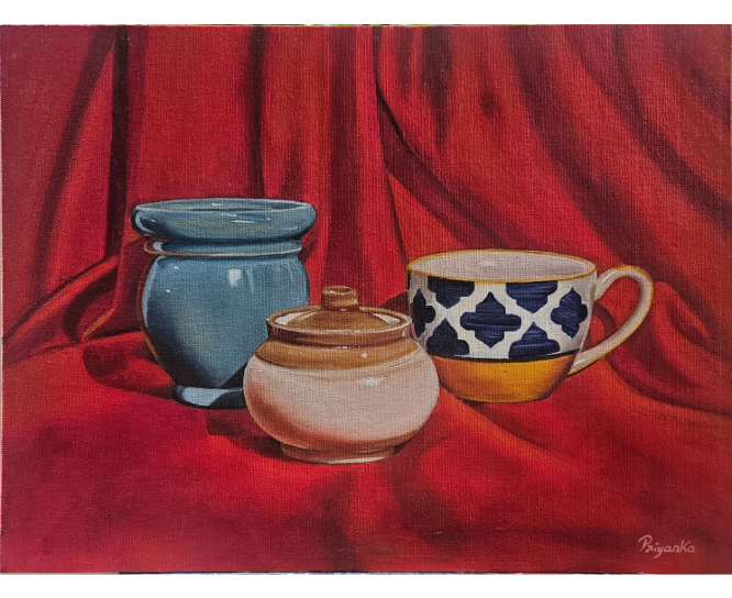 Object-focused painting highlighting ceramic forms with subtle detailing.