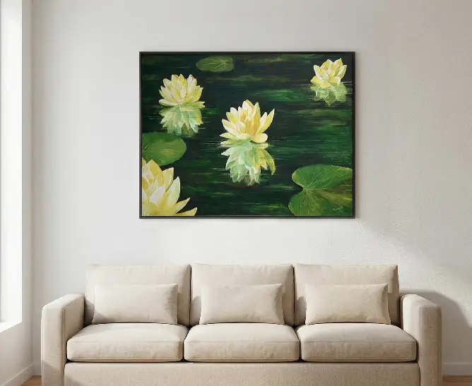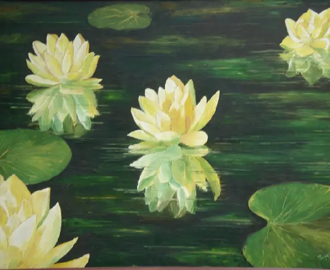 A serene knife painting featuring blooming white lotuses floating peacefully on water symbolizing purity and calmness.